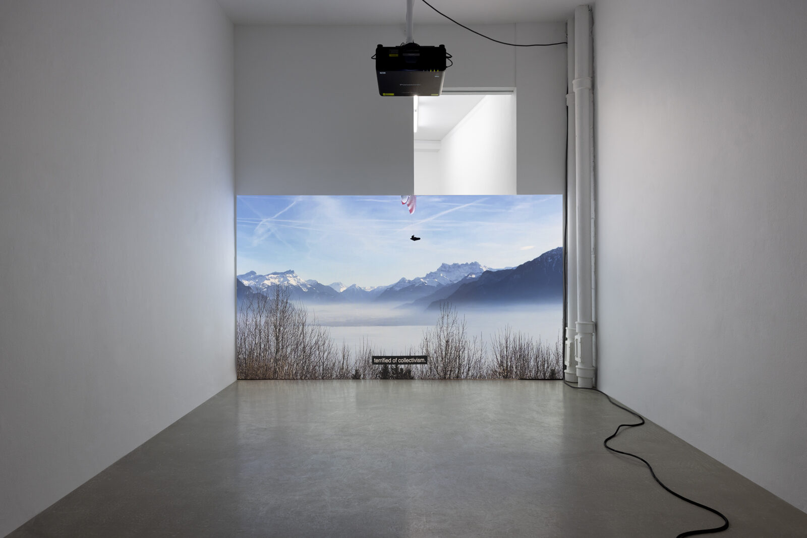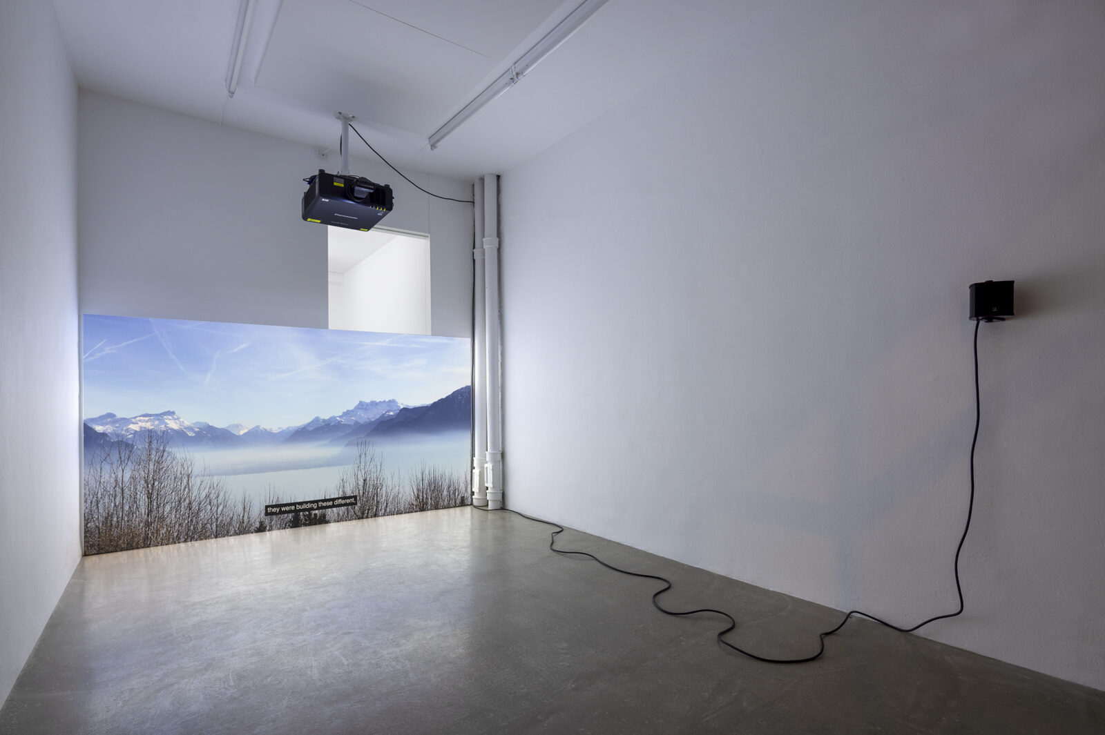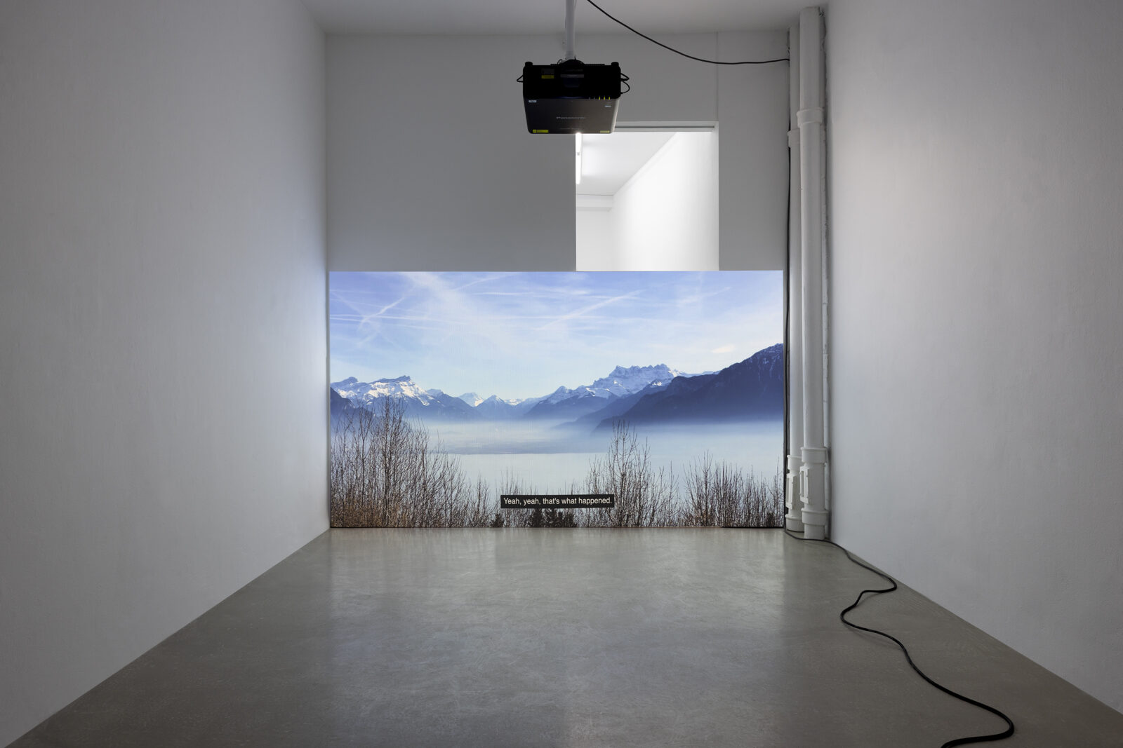 Single-channel digital projection, single-take 4K recording from Hotel du Parc, Mont Pèlerin, Switzerland, single-take sound recording, subtitles