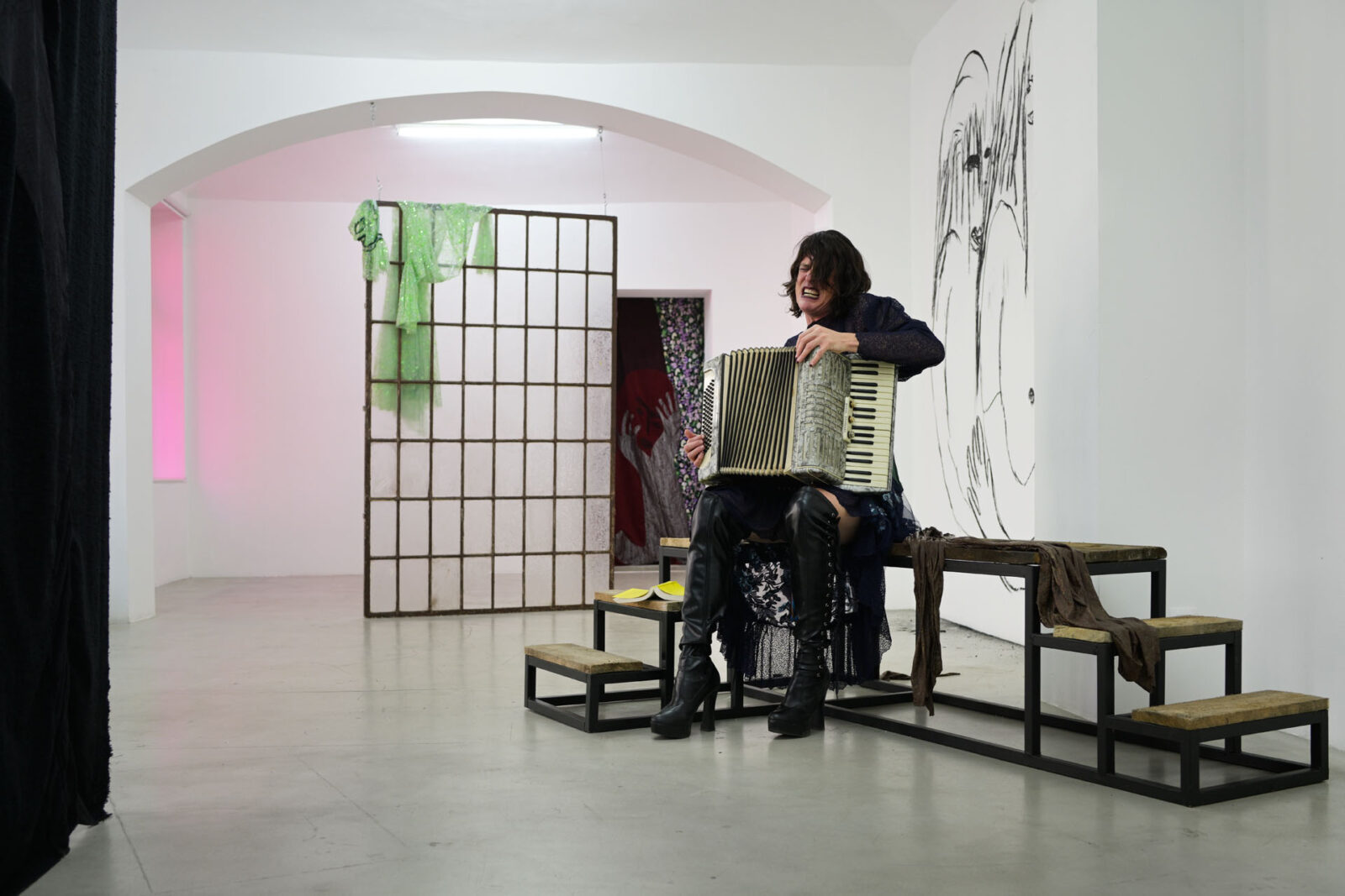 Adam Christensen is a multidisciplinary artist based in London, whose work is primarily realized through textiles, music, and installation, blurring the boundaries between everyday life and fiction. Based on his immediate experiences, colored by the theatricality of every day, the spectacle of domesticity, chance encounters, and emotional and physical dramas, Christensen conveys these experiences through his performances. A primary concern of Christensen’s practice is the construction and representation of space, and what ‘activates’ that space – the unfolding narrative of heartbreak, desire, memory, and identity. He forms a ‘stage’ from which he interacts with the audience and can edit the narrative, often by singing with the accordion and reading short stories, adding layers to a story in a process of continuous development.