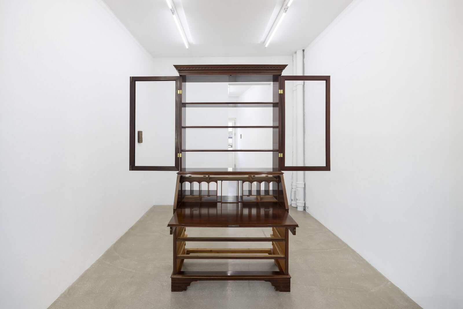 A secretary is a piece of furniture (and it’s a subordinated position, too). Essentially archival when it comes to its function, all those drawers and keyholes and little cabinet doors, even a foldable desk for writing or organizing. Obviously, secrecy is the secretary’s virtue. This piece of furniture has been stripped, undressed plywood beneath the mahogany stain. It’s see-through like the opposite of the privacy its name and appearance initially declare. Exposed and exposing.