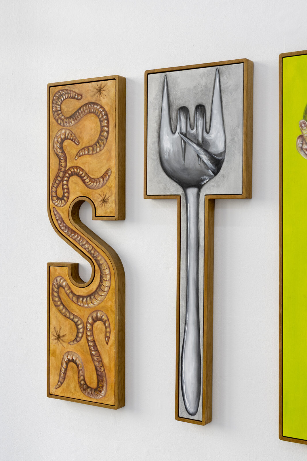 Visiting her Berlin studio I was overwhelmed by the sensitivity Nis-Hansen manages to capture and relay via the caricatured expression that characterizes her figurative style. Between monsters and other trippy figures I traced copied pages from the mother of Virginia Woolf Julia Stephens’ book Notes from Sick Rooms, casually taped on the “back” of Nis-Hansen’s scenography-like series of paintings Employee of the Month. Similarly to the experience of finding a meaningful letter hidden in a drawer, I felt that in these half-covert notes I encountered a secretive gesture, a message: a hint of an artist’s personal references and interests. Whereas the works’ sculptural quality hold a third dimension to Nis-Hansen’s painterly practice, the submerged textual correspondence unfolds a fourth space that reverberates a sense of sisterhood across time and space.