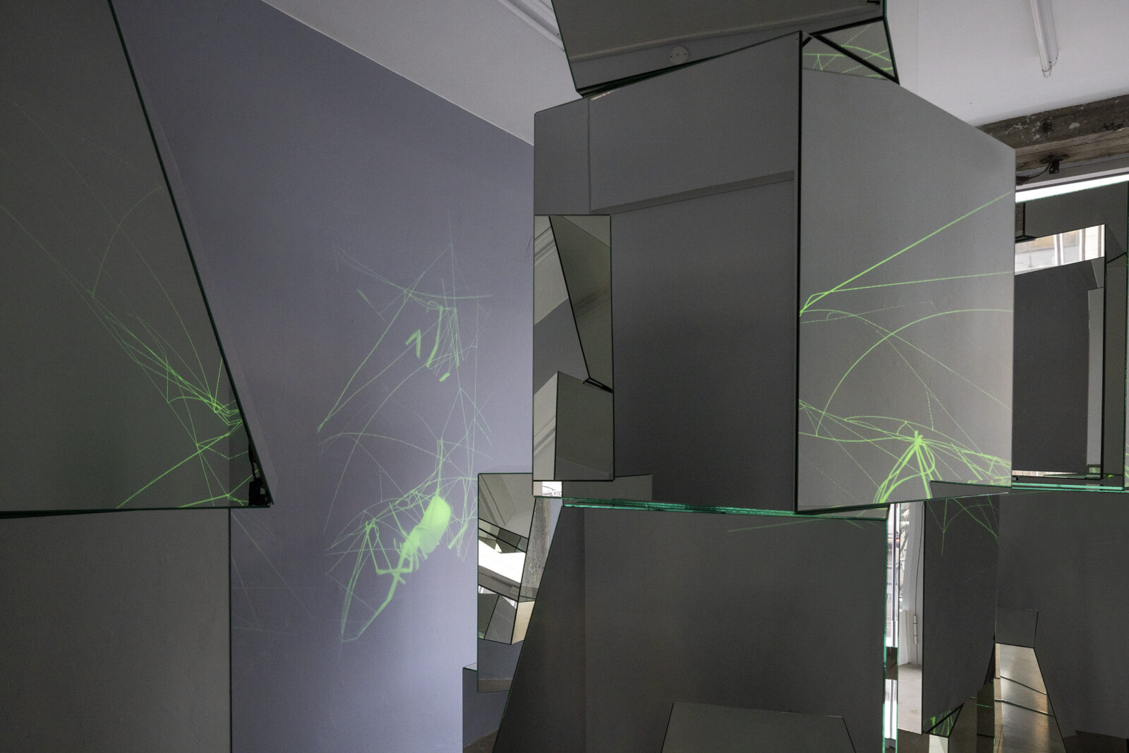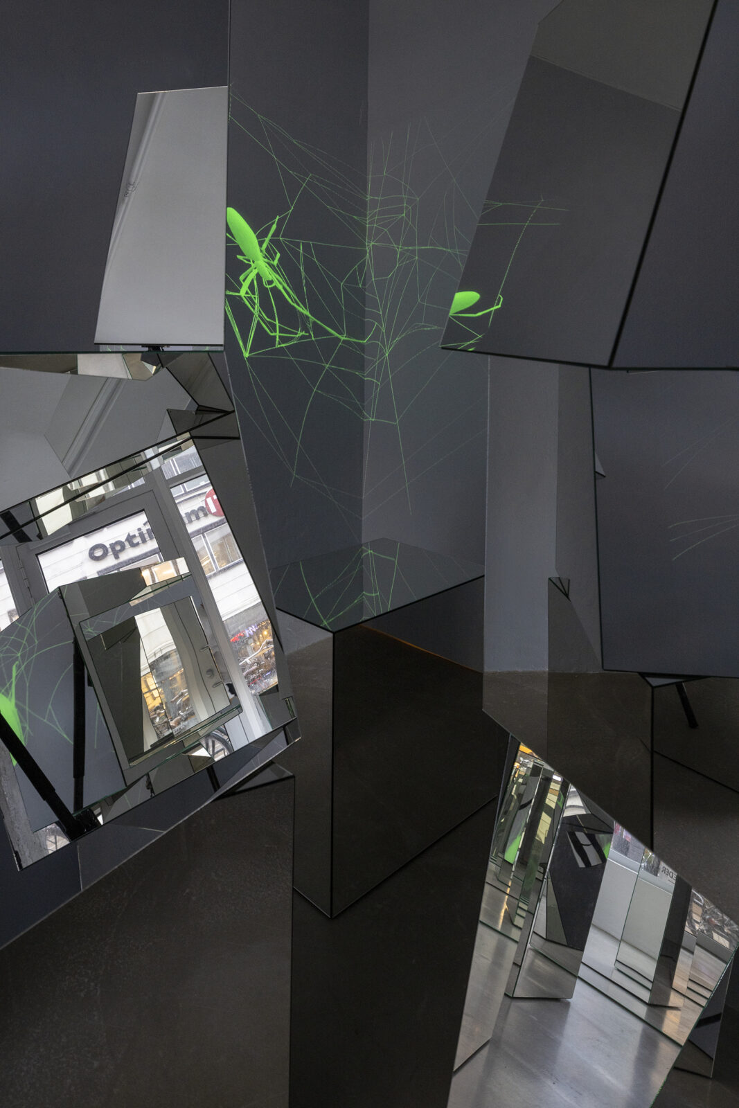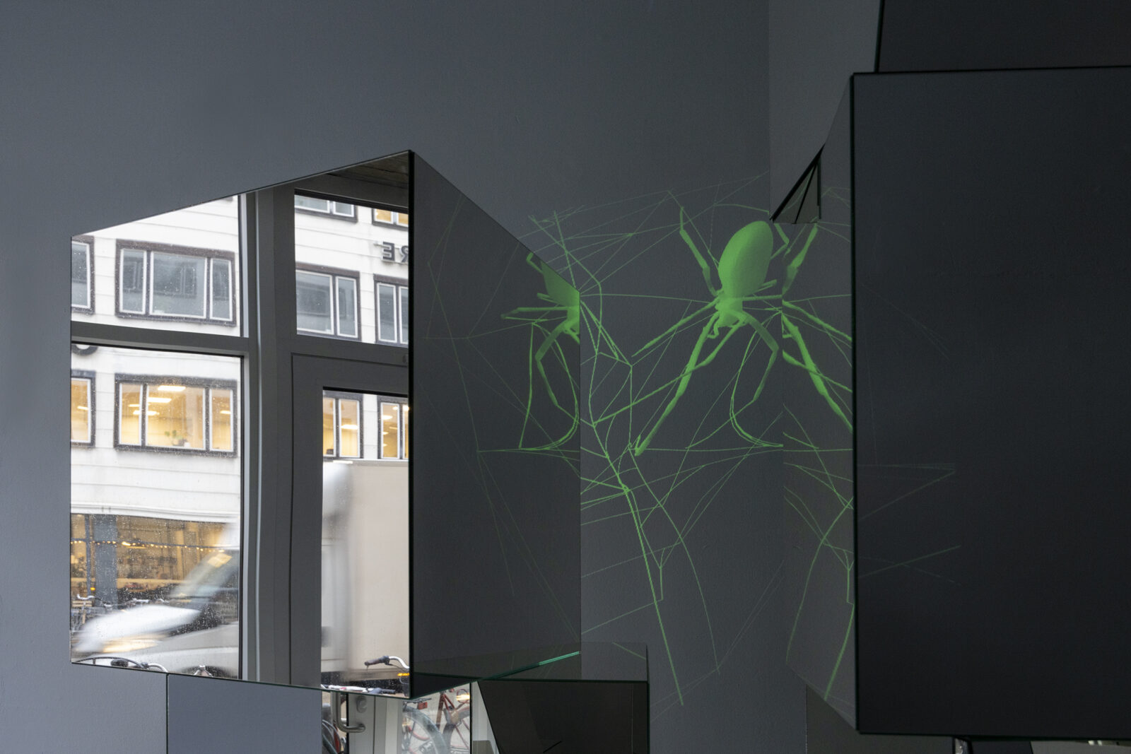 A spider appears at the surface of a mirror module. Effortlessly, it flickers and spins on the reflective skin of the glass forming an interface between her world and ours. The arachnid’s body is glowing green, signaling radioactivity, or a sudden acquisition of night vision on behalf of the viewer—our pupils turned into cameras allowing us to perceive spectral ranges below the capabilities of our naked eyes. In a delicate choreography arranged by Ann Lislegaard, numerous spiders move and weave, extend a leg here and pull a string there. Their work is quiet, we hear no sound. Spiders perceive largely through vibrations transmitted from their webs to their legs, giving away an ambushed insect, or from sound waves of an approaching or receding animal, like us. Yet in this space of science fiction crafted by Lislegaard, anything is possible.