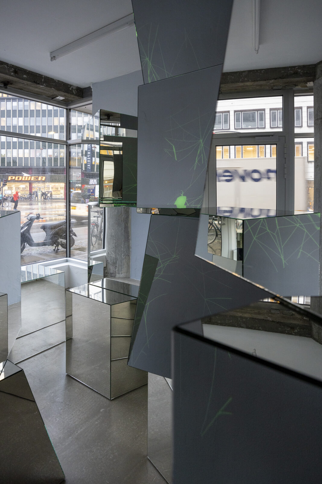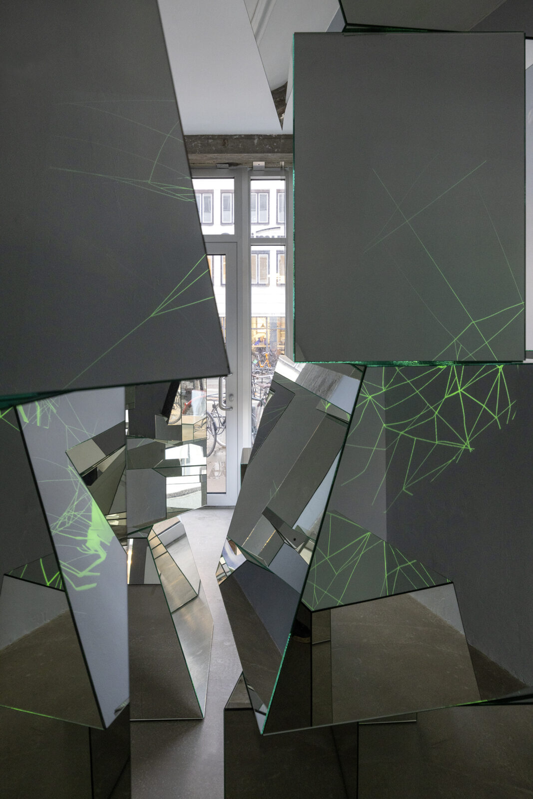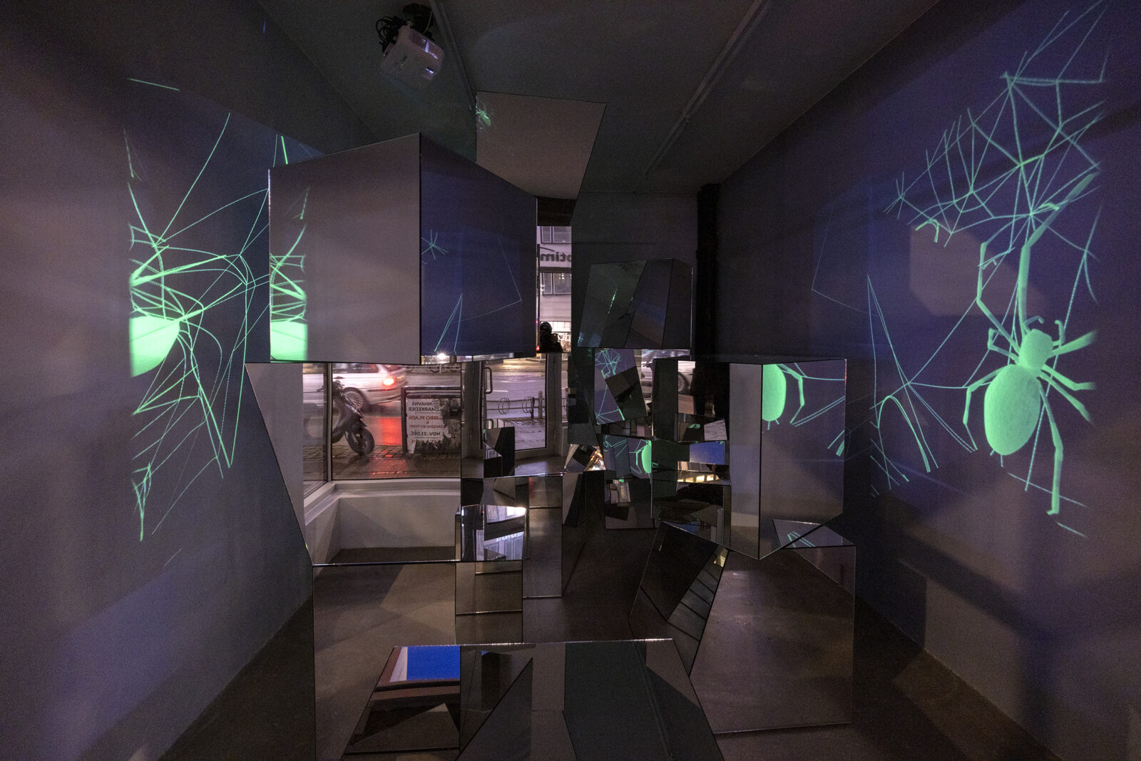 A spider appears at the surface of a mirror module. Effortlessly, it flickers and spins on the reflective skin of the glass forming an interface between her world and ours. The arachnid’s body is glowing green, signaling radioactivity, or a sudden acquisition of night vision on behalf of the viewer—our pupils turned into cameras allowing us to perceive spectral ranges below the capabilities of our naked eyes. In a delicate choreography arranged by Ann Lislegaard, numerous spiders move and weave, extend a leg here and pull a string there. Their work is quiet, we hear no sound. Spiders perceive largely through vibrations transmitted from their webs to their legs, giving away an ambushed insect, or from sound waves of an approaching or receding animal, like us. Yet in this space of science fiction crafted by Lislegaard, anything is possible.