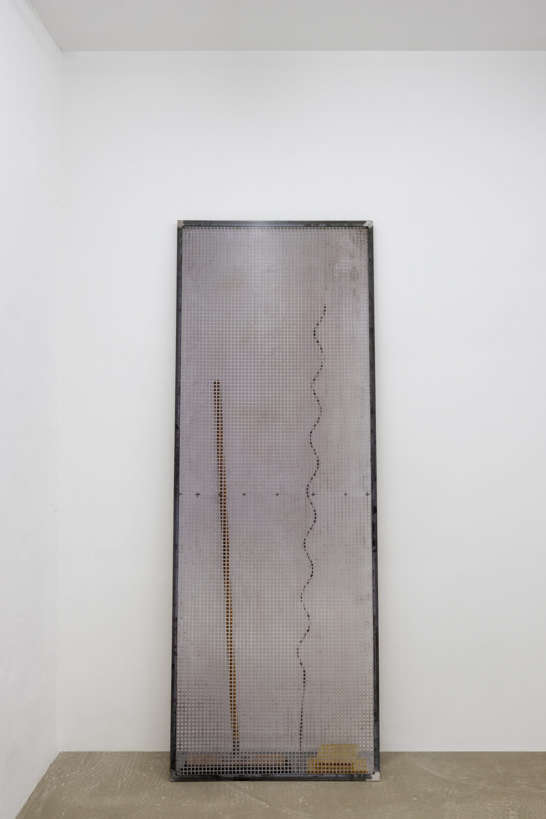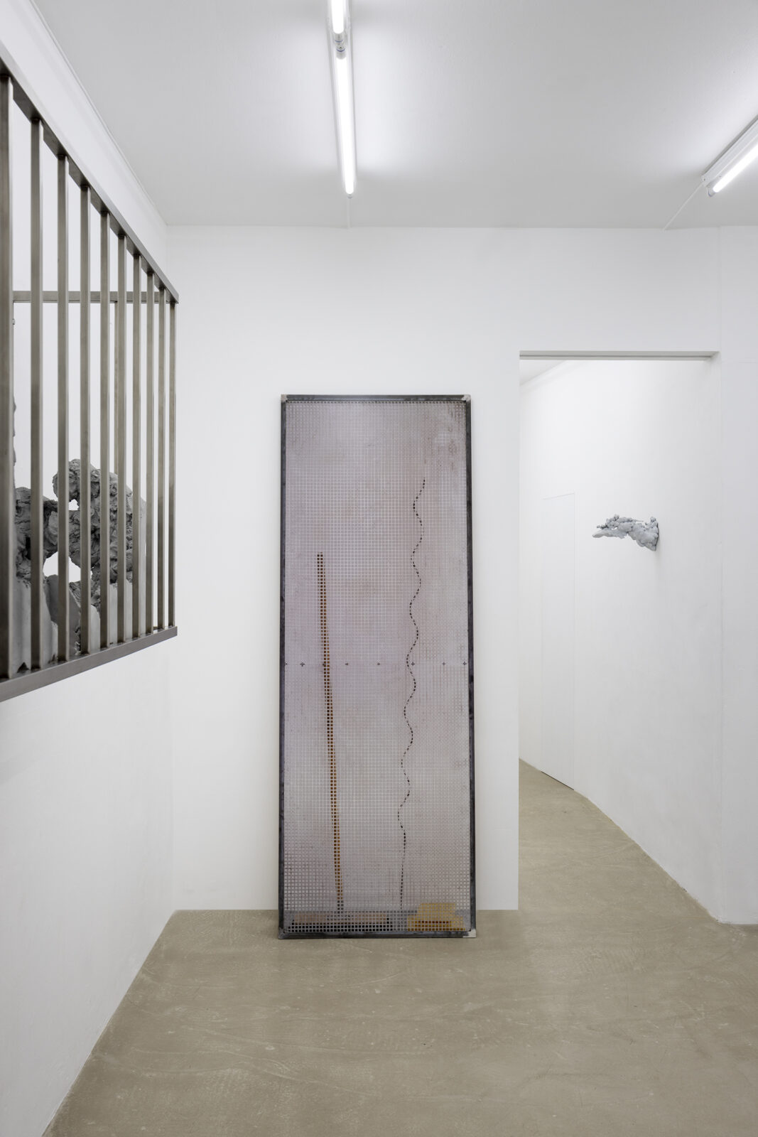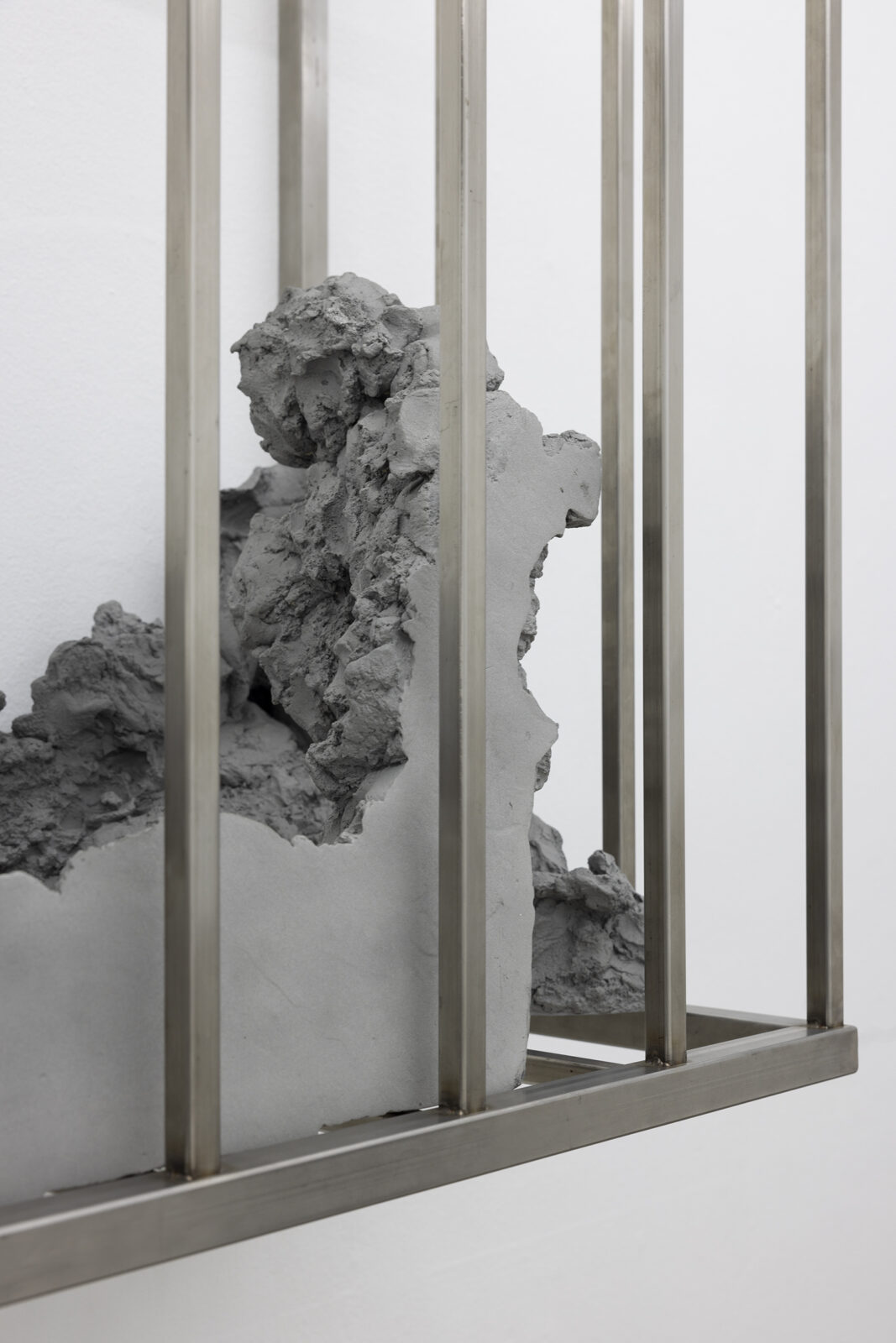 Wax behind bars. Such solid clouds wanting to evaporate or melt down the walls to become a chunky pool of something rain-colored, but they’re held in place. A still life of tools rather than precious ripeness in baroque goblets, and the tools, too, are obstructed. When something is caged, it is either cared for or constrained, maybe both. Balconies might be romance or poetry when they’re all ivy-clad patina and sunset booze, and they might be concrete when they’re all solid and function: elevating a substance from the ground, framing something very elementary. Offering rest or display to these accumulations of allegedly normal matter that also appears indifferent to pedestalization altogether. Beauty is not rejected; it just isn’t pursued.