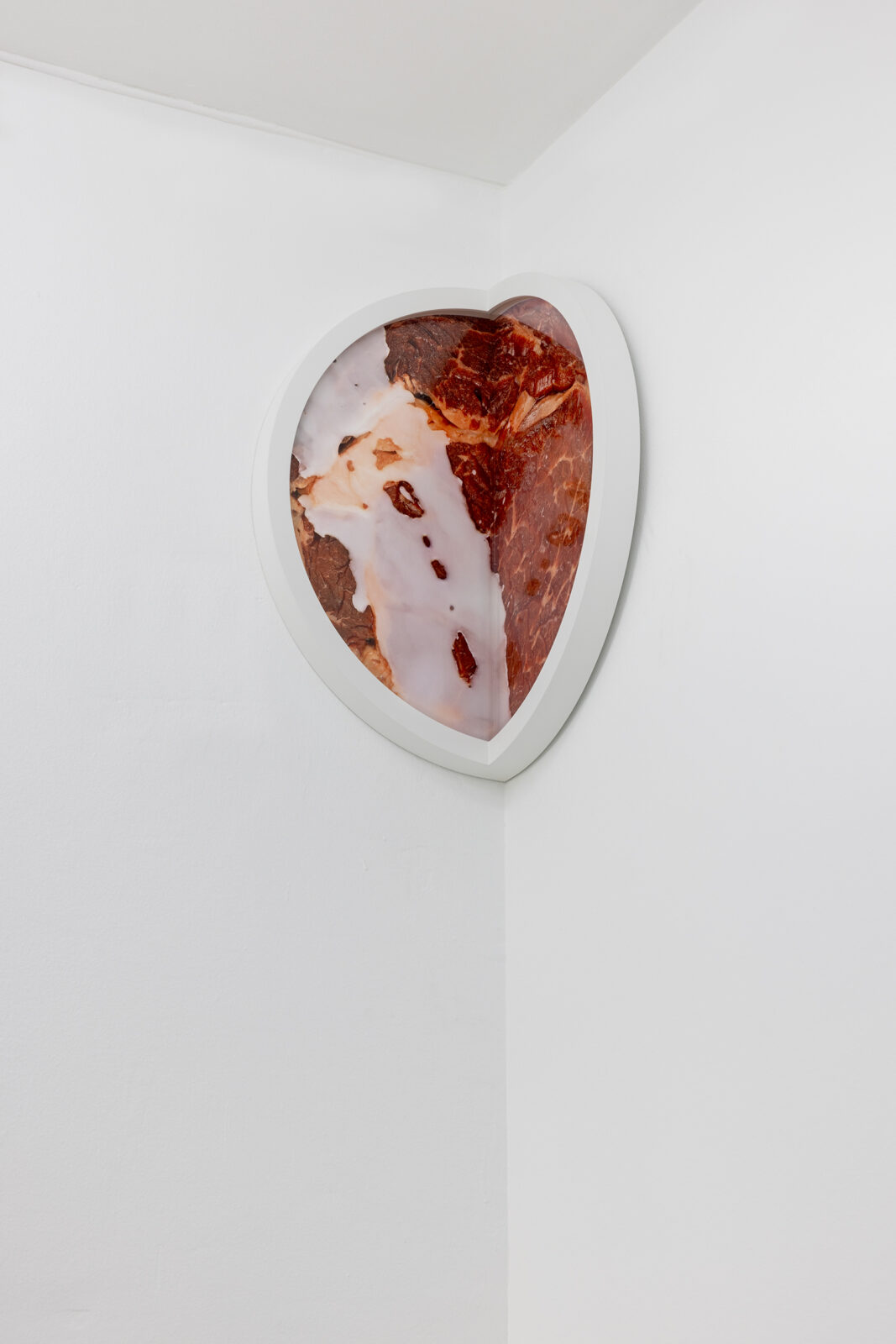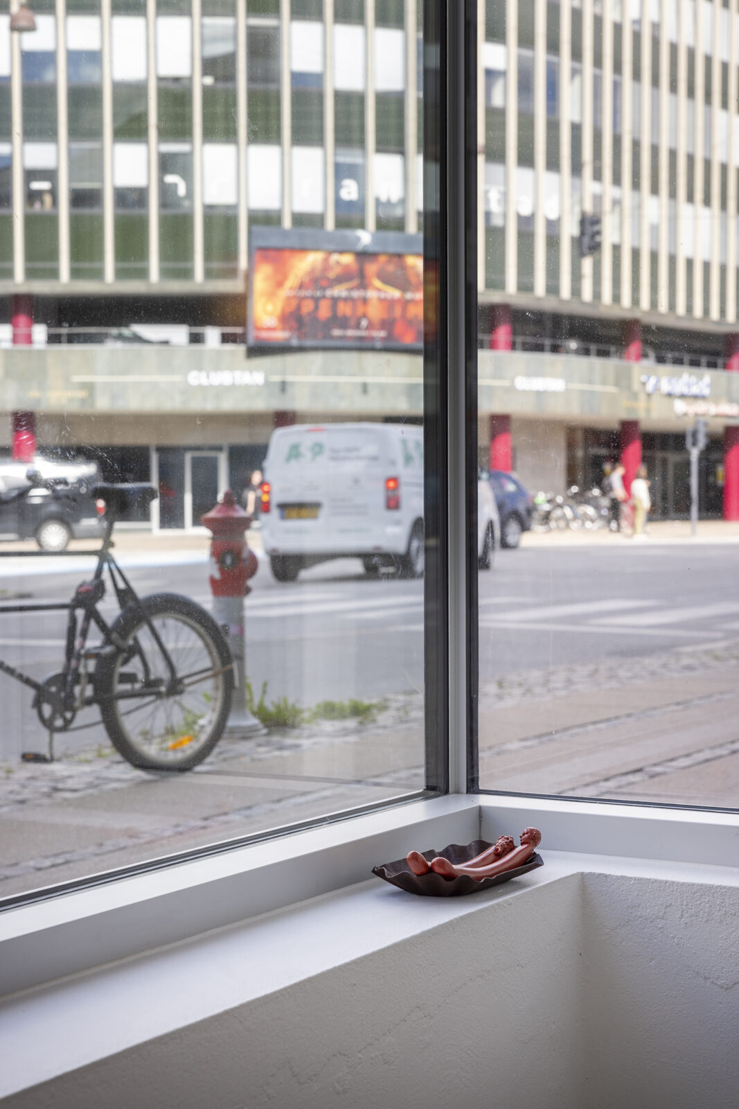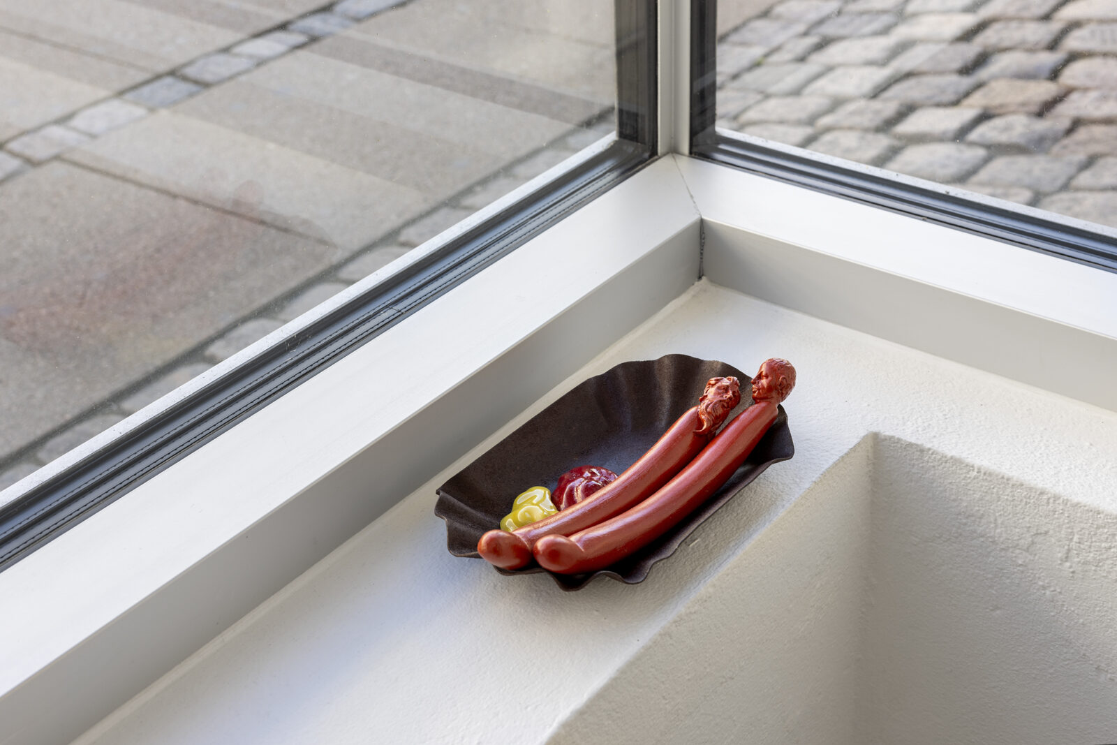 Young-jun Tak’s exhibition aptly titled “Street Religion” opens with the sculpture “Their Presumption of Our Filling,” a work that holds common and religious symbols, with the intention of welcoming passersby into the gallery. The sculpture of two røde pølser (red sausages, or hot dogs, to this American) bear the hand-carved visages of Saint Nicholas in early and old age. Originally the patron saint of ending hunger, Saint Nicholas in many contexts of course also implies the patron saint of milk, cookies, and the raging capitalism of Christmas presents. The two Saint Nicholases nuzzling together with ketchup and mustard in their metal cradle bring this beloved childhood street food, its attendant local nostalgia, and an introductory queerness into the gallery.