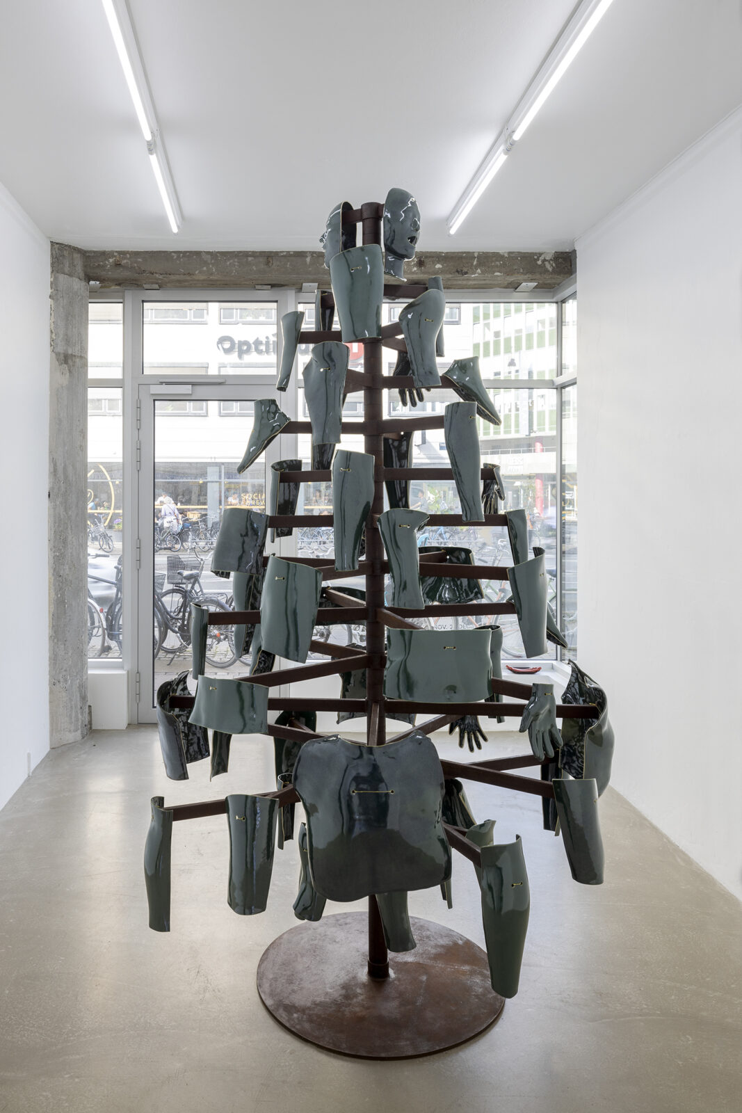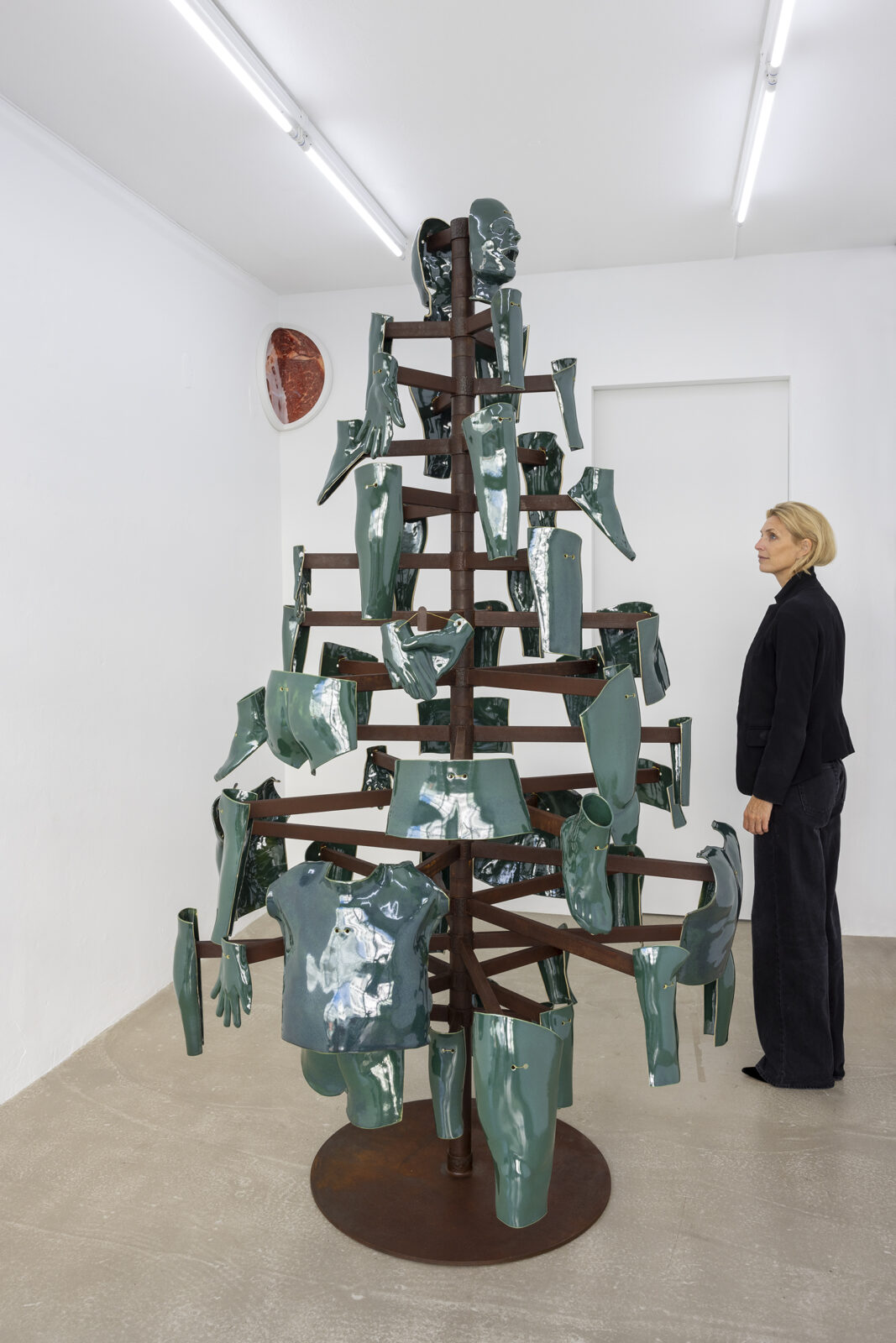 Once inside, the visitor encounters a second sculpture, “Our Holding in Their Gaze,” Tak’s metal and ceramic Christmas tree that dominates the space.