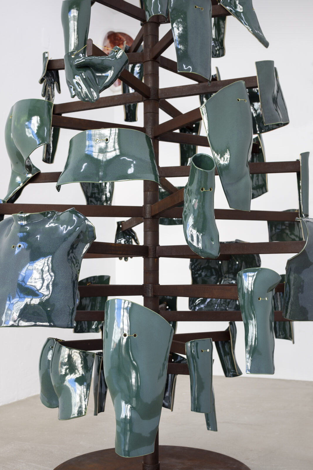 “Our Holding in Their Gaze” is a different kind of Christmas tree—a bare metal frame echoing orthodox crosses, from which hang pine green cast ceramic body parts, instead of decorations and living greenery. His tree speaks to the interruption of queer experiences—intimacy, celebration, protest, marriage—by religious groups convinced that the control of others will lead to their own righteousness. Individuals who take ancient texts read through the lenses of zealots and myopic scholars to hand pick the list of those who are allowed into society and salvation from the fear of death—and those who are not.
