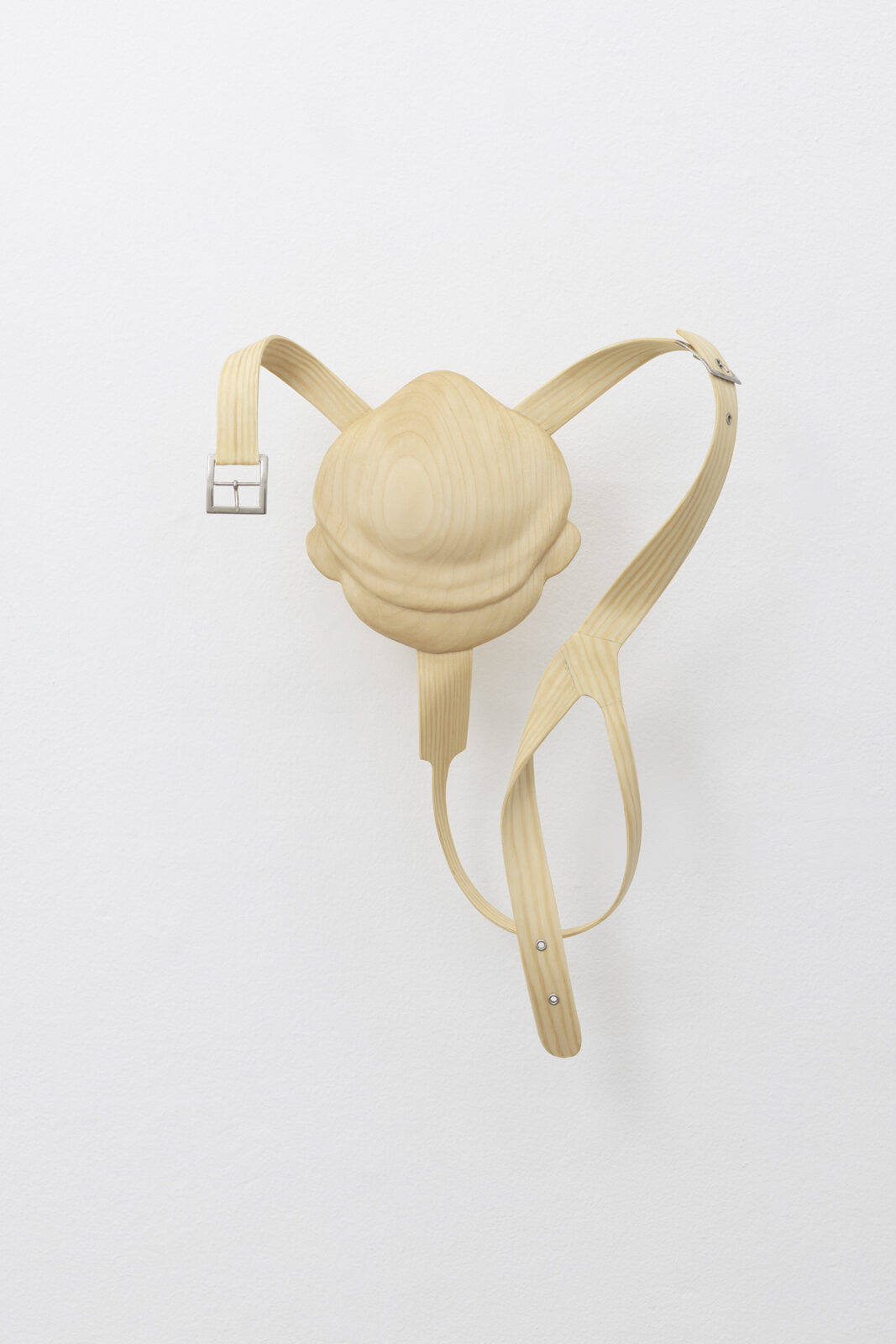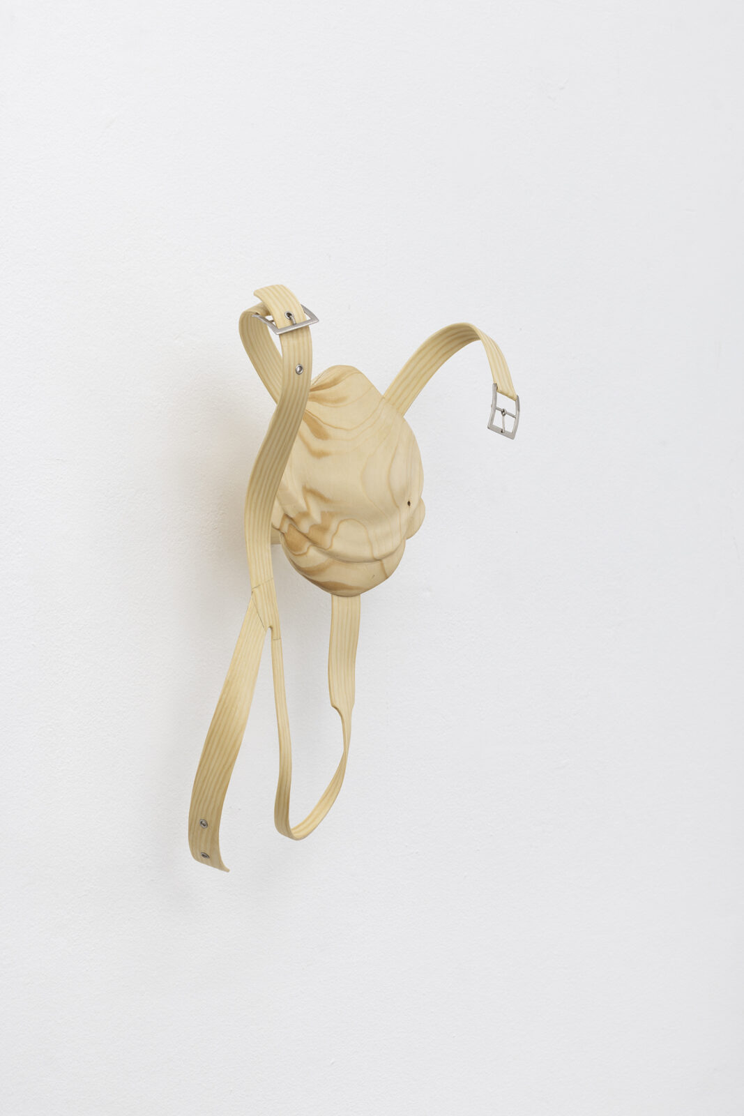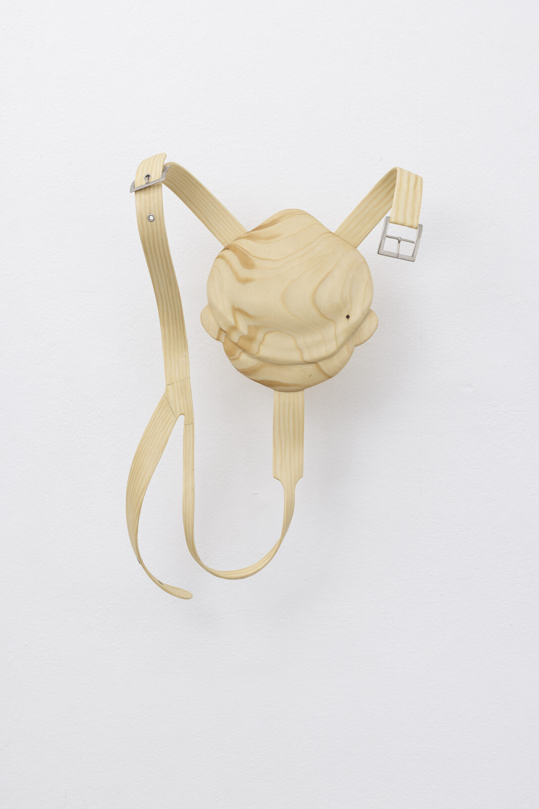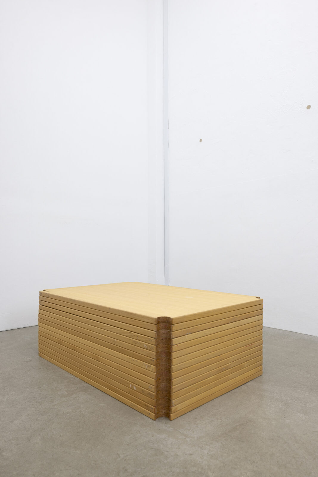 Tie is a group of three wall-mounted, hand-bent sculptures in pine wood with bases shaped like Pinocchio’s face stuck in the wall. Lie moves from the realm of the handcrafted to the mass-produced with its minimalist table tops lying in a stack on the floor echoing the classroom. By bending, stripping, shaping, rearranging mundane objects, Schultz demonstrates how to sculpturally dissect complex, cultural- and material practices.