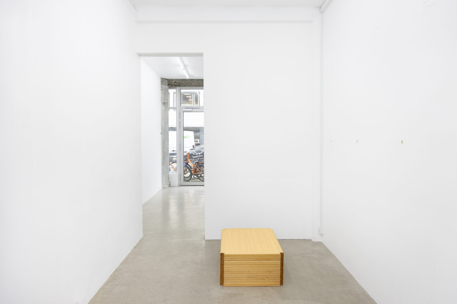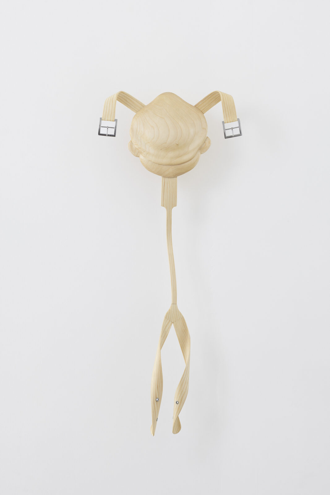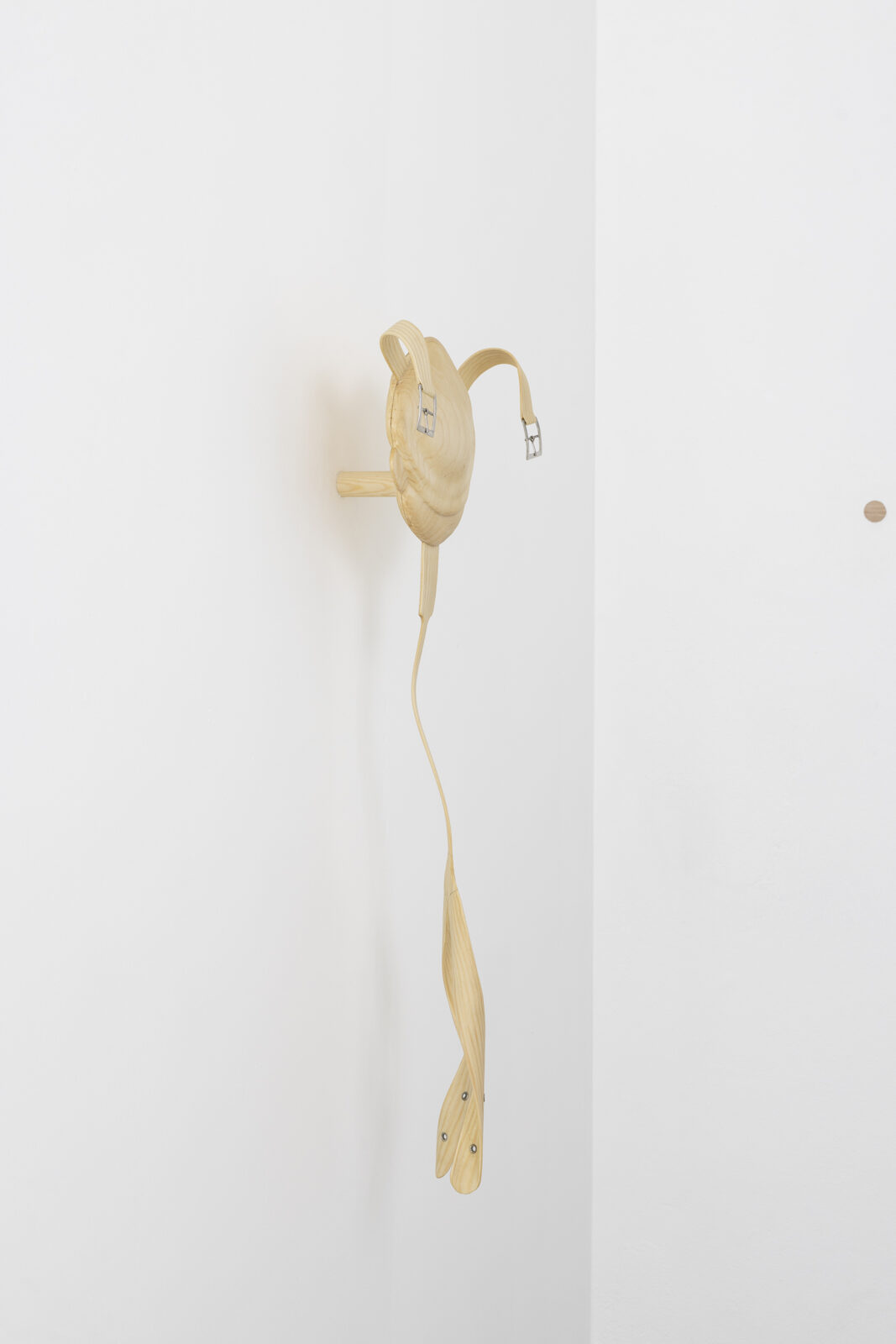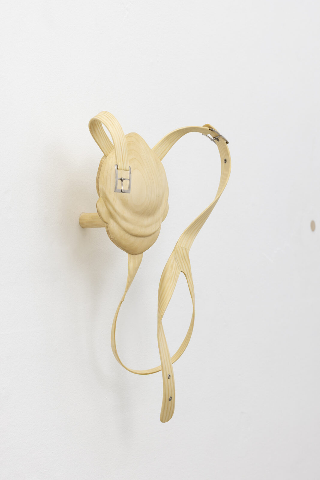 Tie is a group of three wall-mounted, hand-bent sculptures in pine wood with bases shaped like Pinocchio’s face stuck in the wall. Lie moves from the realm of the handcrafted to the mass-produced with its minimalist table tops lying in a stack on the floor echoing the classroom. By bending, stripping, shaping, rearranging mundane objects, Schultz demonstrates how to sculpturally dissect complex, cultural- and material practices.